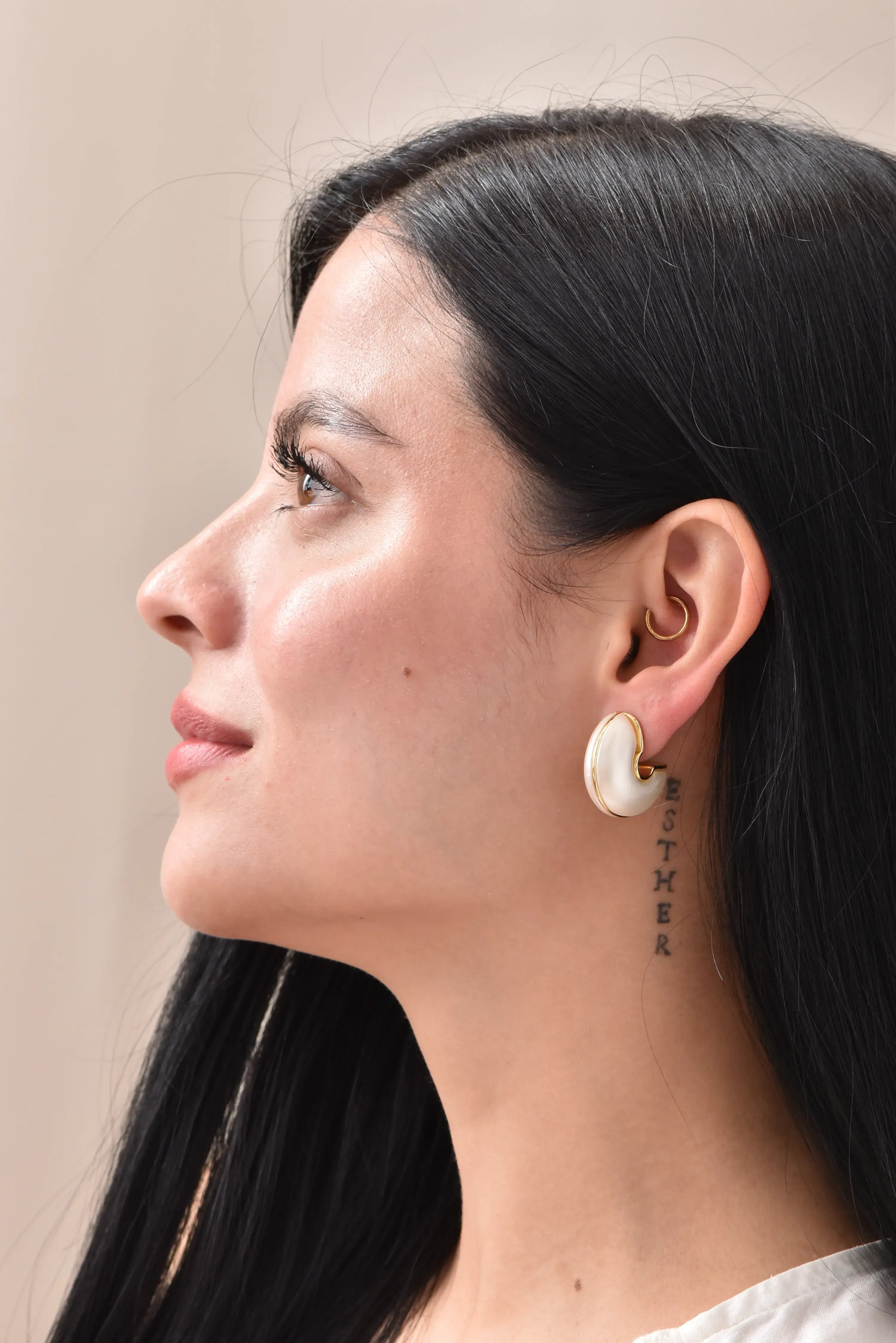 Aretes topo en tono beige neutro con acabado liso y un delicado borde dorado en baño de oro 24K. Un diseño elegante y versátil que combina con cualquier look, perfecto para usar de día o de noche.