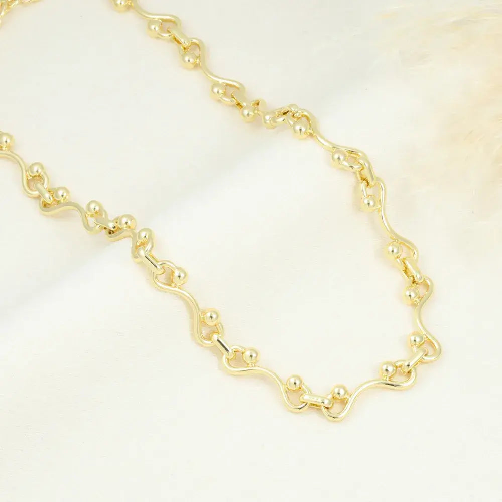 Cadena dorada elaborada en baño de oro 24K, compuesta por eslabones curvos con detalles de balines integrados. Su estructura ofrece resistencia para el uso diario.