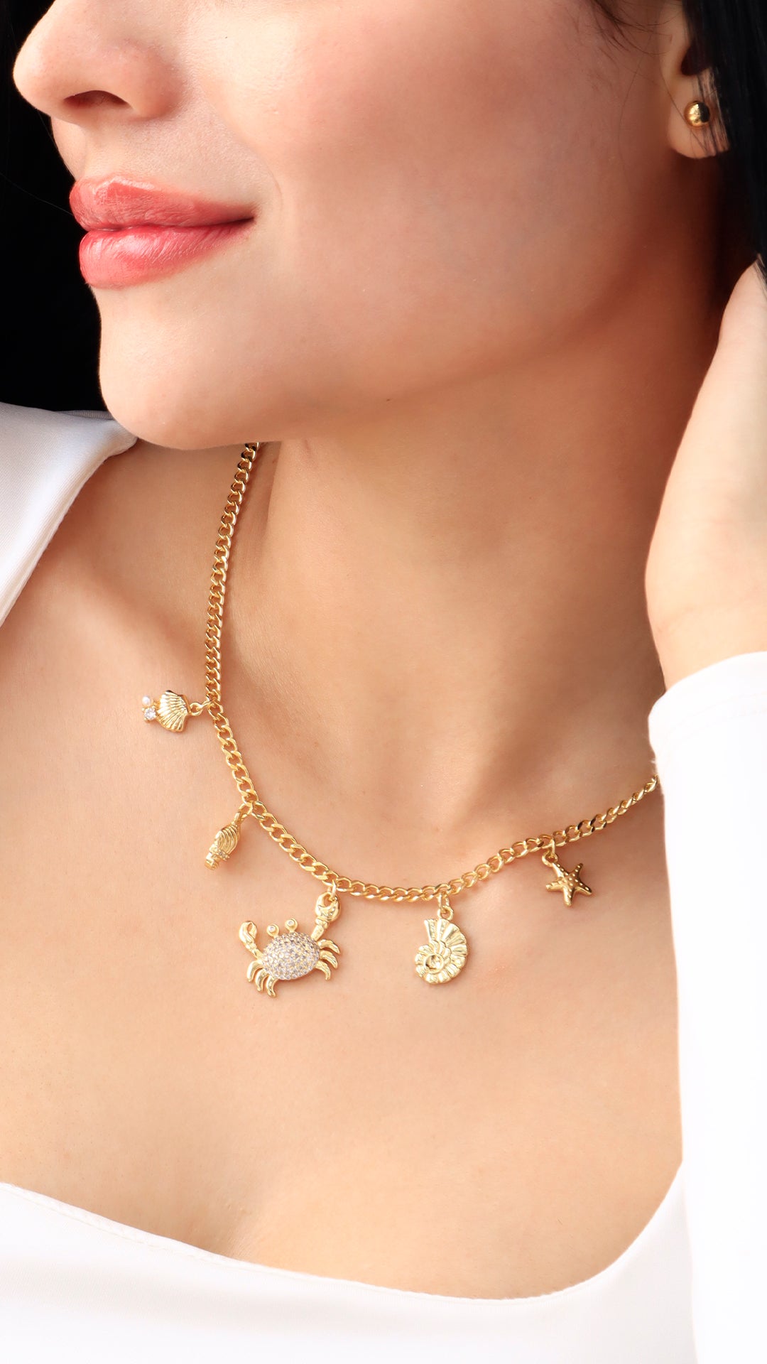 Collar con dijes de cangrejo inspirado en el encanto del mar, elaborado en baño de oro 24K ensamblado que aporta un acabado brillante y duradero. Un accesorio único que refleja frescura y originalidad, ideal para looks veraniegos o temáticos.