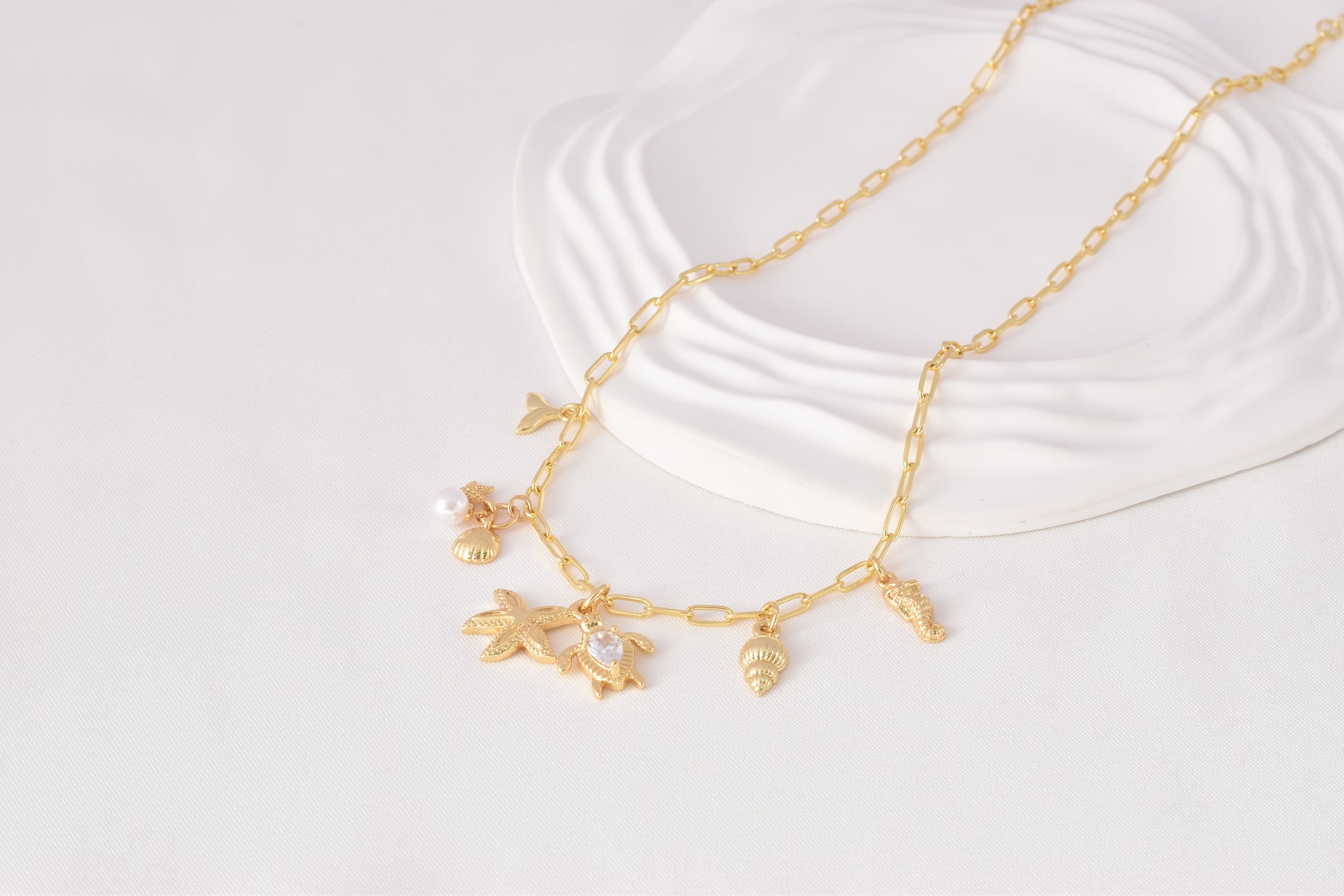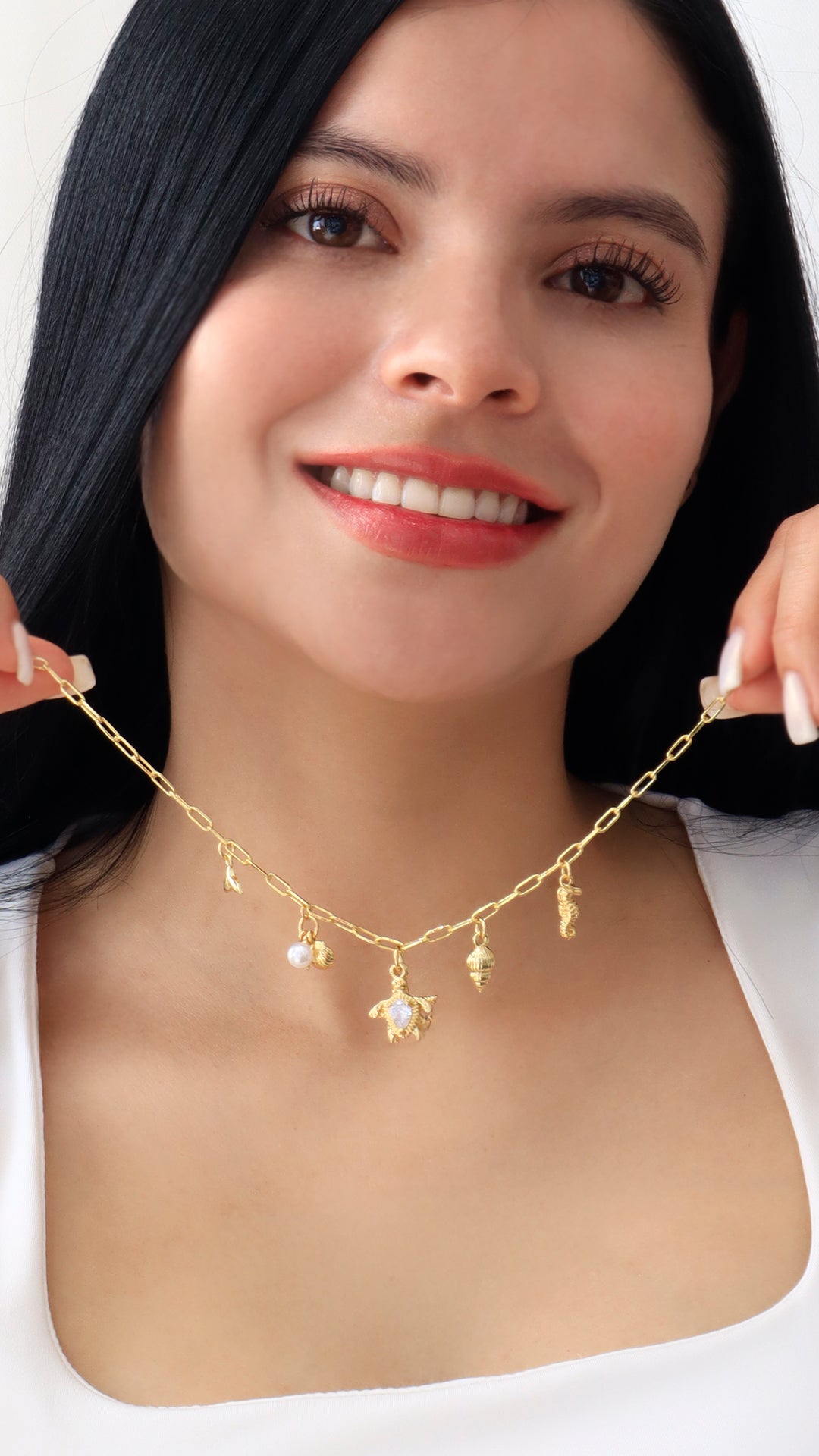 Collar con dijes de tortuga inspirado en la fauna marina, elaborado en baño de oro 24K ensamblado que realza su brillo y resistencia. Un accesorio encantador que combina simbolismo y estilo, perfecto para quienes aman los detalles con temática oceánica.