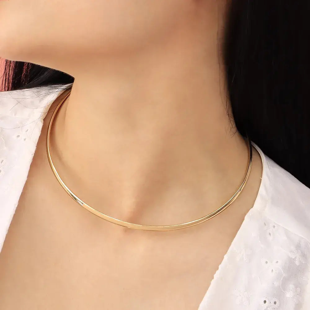 Esta gargantilla rígida en baño de oro 24K es el complemento ideal para realzar cualquier look con un toque elegante y moderno. Su acabado brillante y diseño ajustado al cuello la convierten en una pieza esencial para usar sola o combinar con collares delicados.