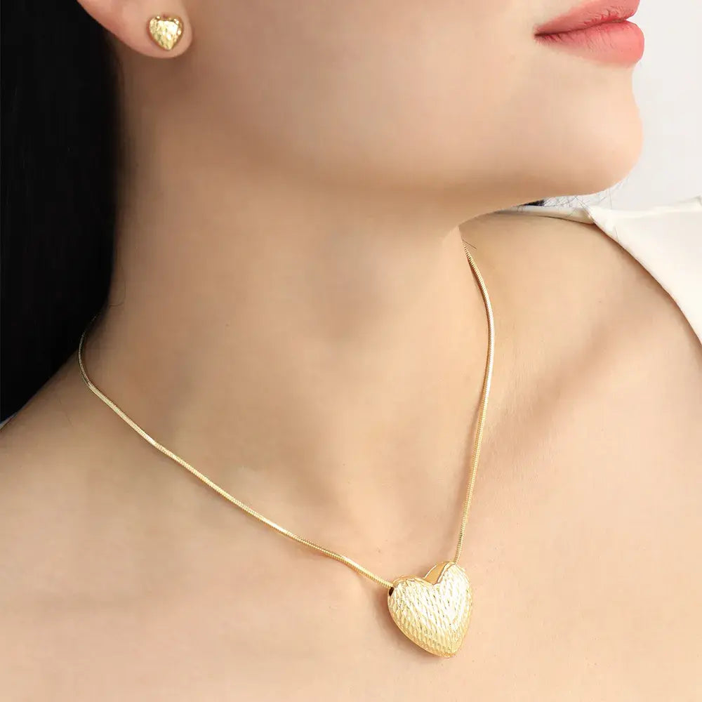 Este juego de corazón en baño de oro incluye collar y aretes topo, diseñados para brillar con delicadeza y sumar un toque romántico a cualquier look.