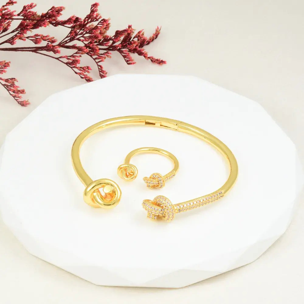 Juego compuesto por brazalete rígido y anillo ajustable con diseño de nudo. Ambos cuentan con acabado en baño de oro 24K; el brazalete combina un extremo liso con otro decorado con microcircones incrustados, y el anillo mantiene la misma línea de diseño con detalle de brillo en el nudo.